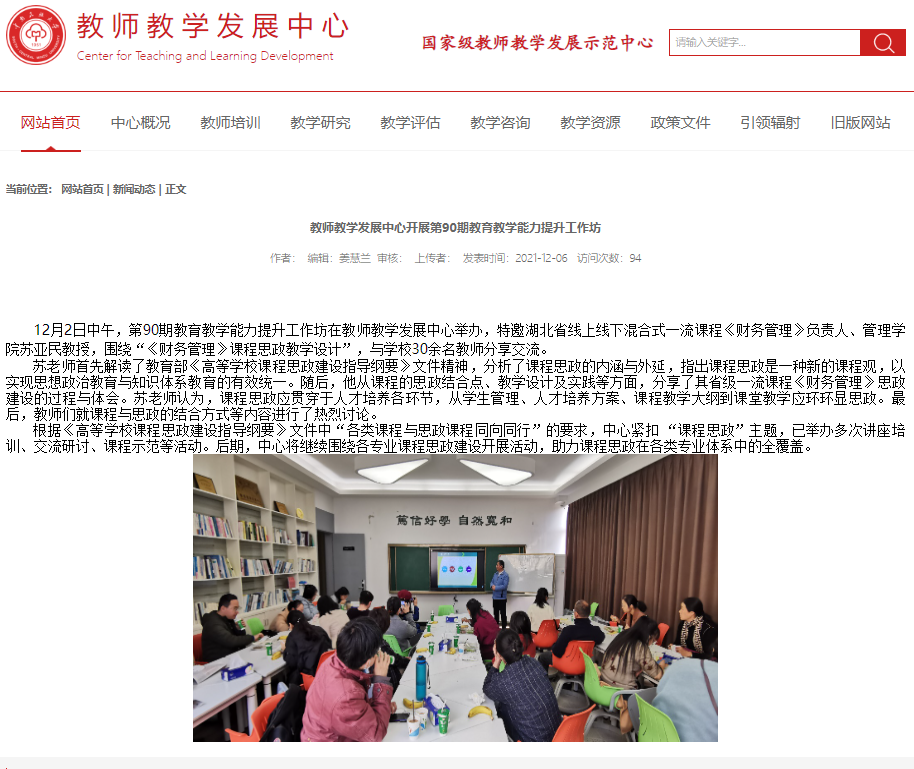 2021年12月2日中午,第90期教育教學(xué)能力提升工作坊在教師教學(xué)發(fā)展中心舉辦,特邀湖北省線上線下混合式一流課程《財(cái)務(wù)管理》負(fù)責(zé)人、管理學(xué)院蘇亞民教授,圍繞“《財(cái)務(wù)管理》課程思政教學(xué)設(shè)計(jì)”,與學(xué)校30余名教師分享交流。(教師教學(xué)發(fā)展中心開(kāi)展第90期教育教學(xué)能力提升工作坊)