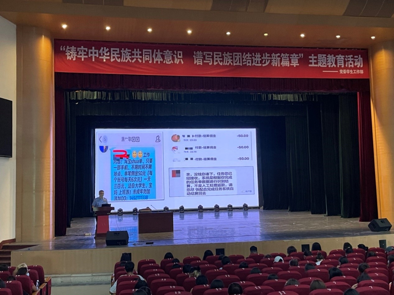 陶警官根據(jù)當前國家安全新形勢,緊密結(jié)合校園學習生活實際,以自身多年的從警經(jīng)驗,為在場全體師生做了一場國家安全、社會和諧、校園穩(wěn)定、學生平安等方面的講座。從防范電信網(wǎng)絡詐騙、非法校園貸、禁毒等內(nèi)容為切入,通過數(shù)據(jù)、案例、視頻等形式深度剖析了大學生所面臨的潛在安全隱患,幫助大學生增強了安全防范意識,引導學生樹立正確的國家安全觀。黨委學生工作部艾力亞老師緊緊圍繞“新時代我國政治安全與大學生日常學習生活”主題,結(jié)合自身工作經(jīng)驗以及生動案例,從歷史問題、國內(nèi)外形勢、當前局勢等方面講解了政治安全的重要性。