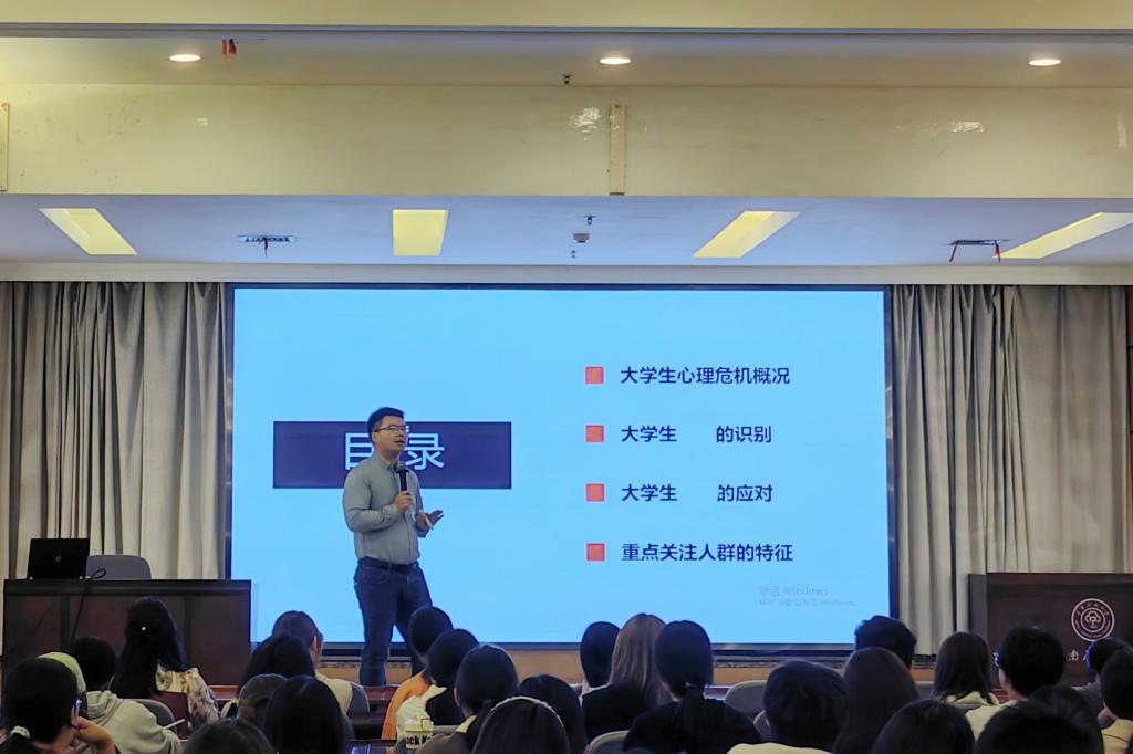 為切實提升學校心理育人質量,提升心理委員的工作能力,充分發揮心理委員在心理健康教育工作中的作用,時值10月10日“世界精神衛生日”到來之際,我校學生心理健康教育中心在潤良報告廳成功舉辦以“大學生心理危機的識別與應對”為題的心理委員培訓講座,并有幸邀請中南財經政法大學余金聰副教授為主講人。學校黨委學生工作部副部長、心理健康教育中心主任方明主持講座,全校2023級心理委員及學工部心理健康教育中心全體教師參加本次活動。