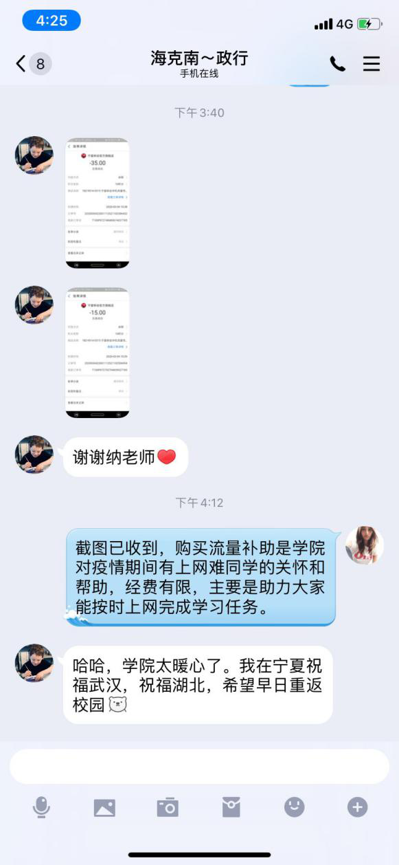 學生收到流量幫助后的反饋。 同學們紛紛表示學院的舉動特別“暖心”,來自新疆的曲胡拉同學接收到流量補助后表達了自己對學院的感激和在接下來的日子會更用心更努力學習的決心。來自寧夏的??四贤瑢W在感激中同時表達了對武漢對湖北的祝福,他說“希望能早日返回校園?!?/span> 據了解,學院計劃4月份繼續資助一批家庭經濟困難同學的網課流量,疫情不完,資助不斷。同時也會采取更多的舉措助力學生上好網課。學院表示,同學們只管安心學習,增強本領,任何困難我們都會一起面對,一起克服,對學習如此,對這場疫情更是如此。 (來源:公共管理學院 編輯:梁瀟瀟)