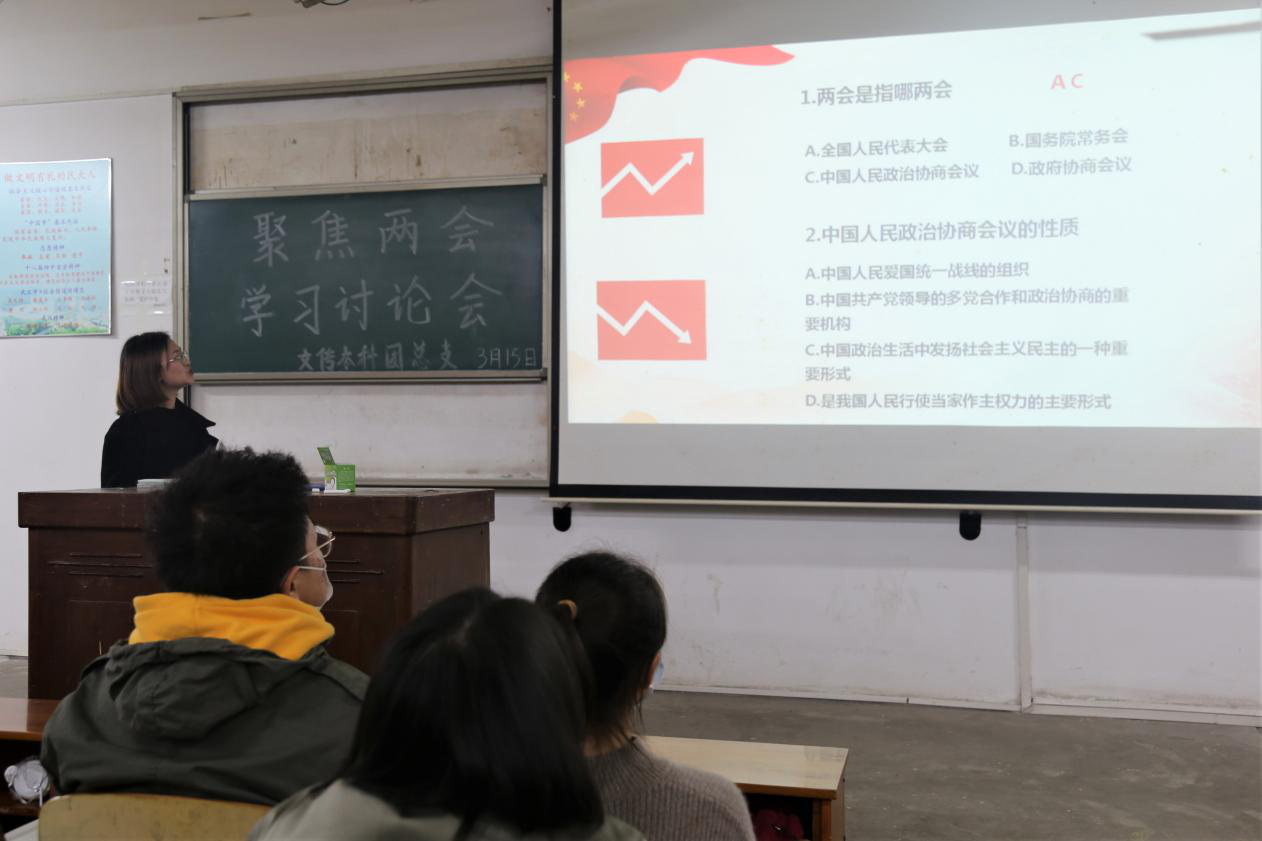 3月15日中午12:30,文學與新聞傳播學院在文一樓201教室開展了聚焦“兩會”主題團會,團總支組織部王婧同學擔任主持人,團總支全體成員參與本次團會。