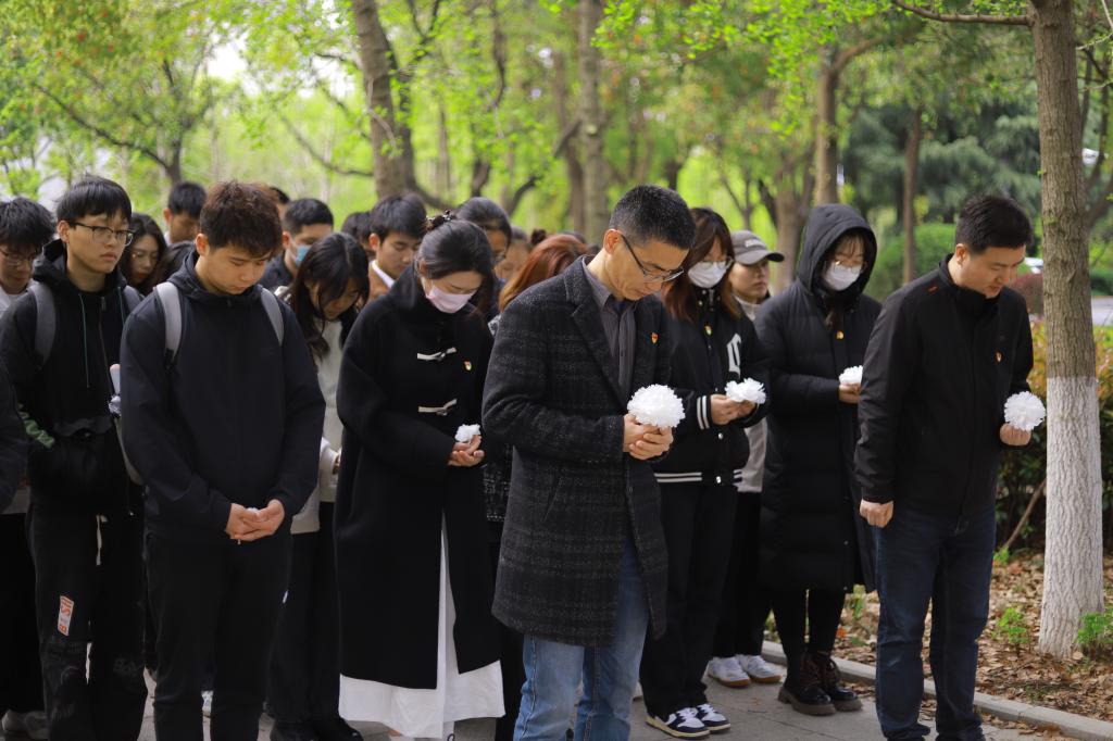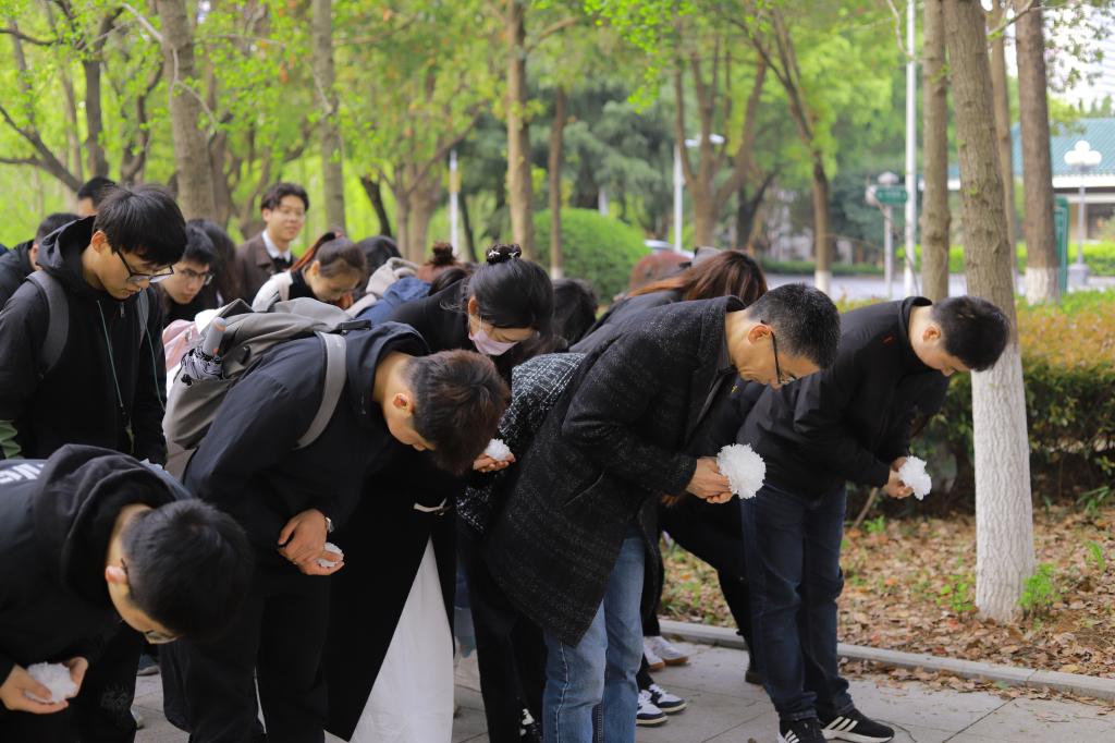 隨后,全體成員肅立默哀一分鐘,接著師生一道向吳澤霖先生雕像三鞠躬,獻上一對花籃和師生們親手制作的白花,以表達深深感激和無限哀思之情。