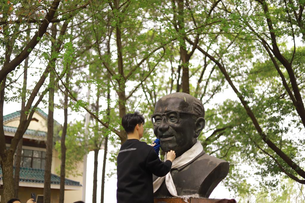 黨員學生代表擦拭吳澤霖先生雕像。 文曉軒 攝