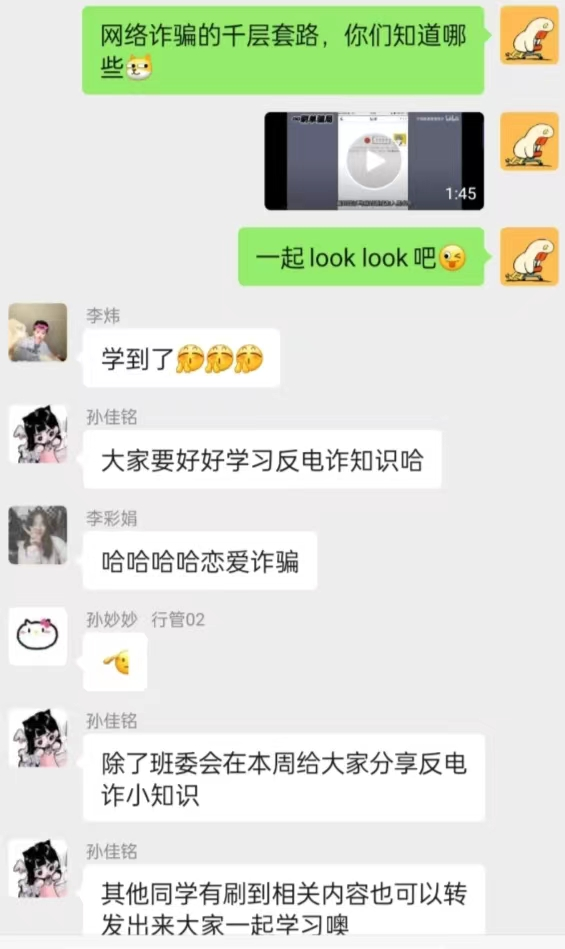 各級(jí)各班積極響應(yīng),深入宣傳防詐騙,宣傳形式具體包括開(kāi)展主題班會(huì)介紹詐騙形式及防詐騙的技巧、在班群內(nèi)提醒同學(xué)們防詐騙、發(fā)布防詐騙視頻、下載國(guó)家反詐中心APP……形式多樣,效果顯著。