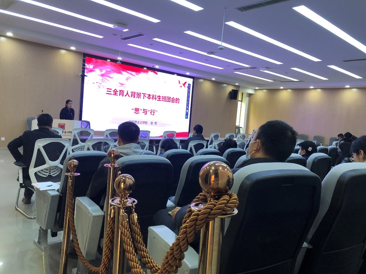 會上,金瑤老師基于自身的思想政治教育學習背景和工作實踐經驗,從高校思政工作在“三全育人”體系中的重要性切入,詳細闡釋了班導師開展班團會的不可或缺性;逐一分析了組織開展高質量主題班團會的要素,包括三個聚焦即主題、問題、學生,四個提升即設計感、儀式感、參與感、獲得感;五個必備即選題鮮明、素材豐富、講解透徹、互動充分、反思到位。金瑤老師圍繞“全國兩會”和“國家安全教育日”為案例主題,詳細介紹了主題班團會的素材搜集、組織設計、過程管理和效果轉化四個方面的重點內容。