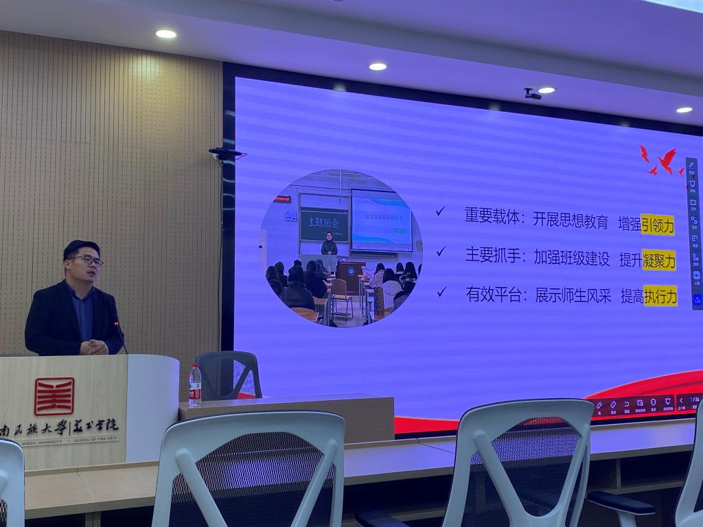 按照美術學院黨政聯席會議和黨委會會議研究制訂的2023年度工作計劃,為提升全院班導師思政課和主題班團會設計質量,提高班導師開展主題班團會的能力和水平,3月30日14點,美術學院在美術館報告廳舉辦了第一期班導師集體備課暨思政教育主題班團會內容設計輔導報告會。馬克思主義學院學工辦主任、輔導員、班導師金瑤老師應邀做了題為“三全育人背景下本科生班團會的‘思’與‘行’”的主題報告,報告由美術學院黨委副書記張雯君主持,美術學院各年級班導師五十余人參加了輔導報告會。