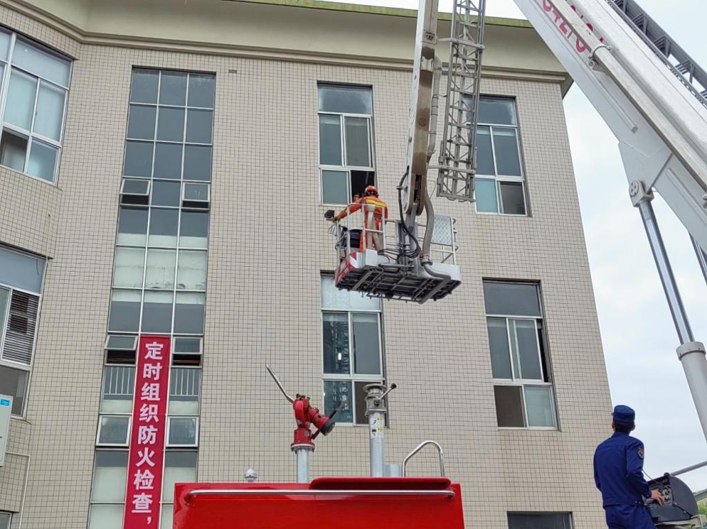 圖為云梯救援高處被困人員。 石馨雨攝