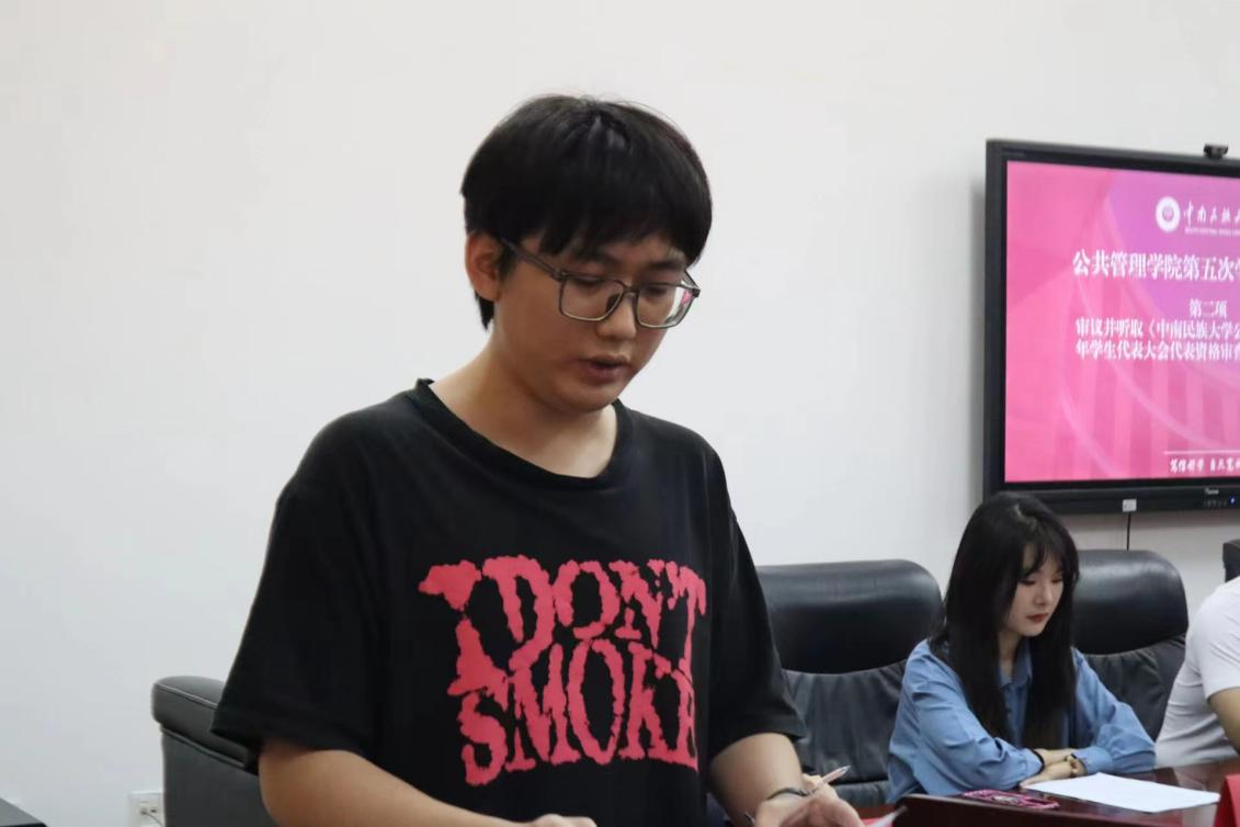 隨后,大會聽取并審議了《中南民族大學公共管理學院2023年學生代表大會代表資格審查報告(草案)》、《中南民族大學公共管理學院第五次學生代表大會選舉辦法(草案)》、《中南民族大學公共管理學院第五次學生代表大會監計票人建議名單》。經全體參會代表舉手表決,同意人數皆過半,上述文件都獲得通過。