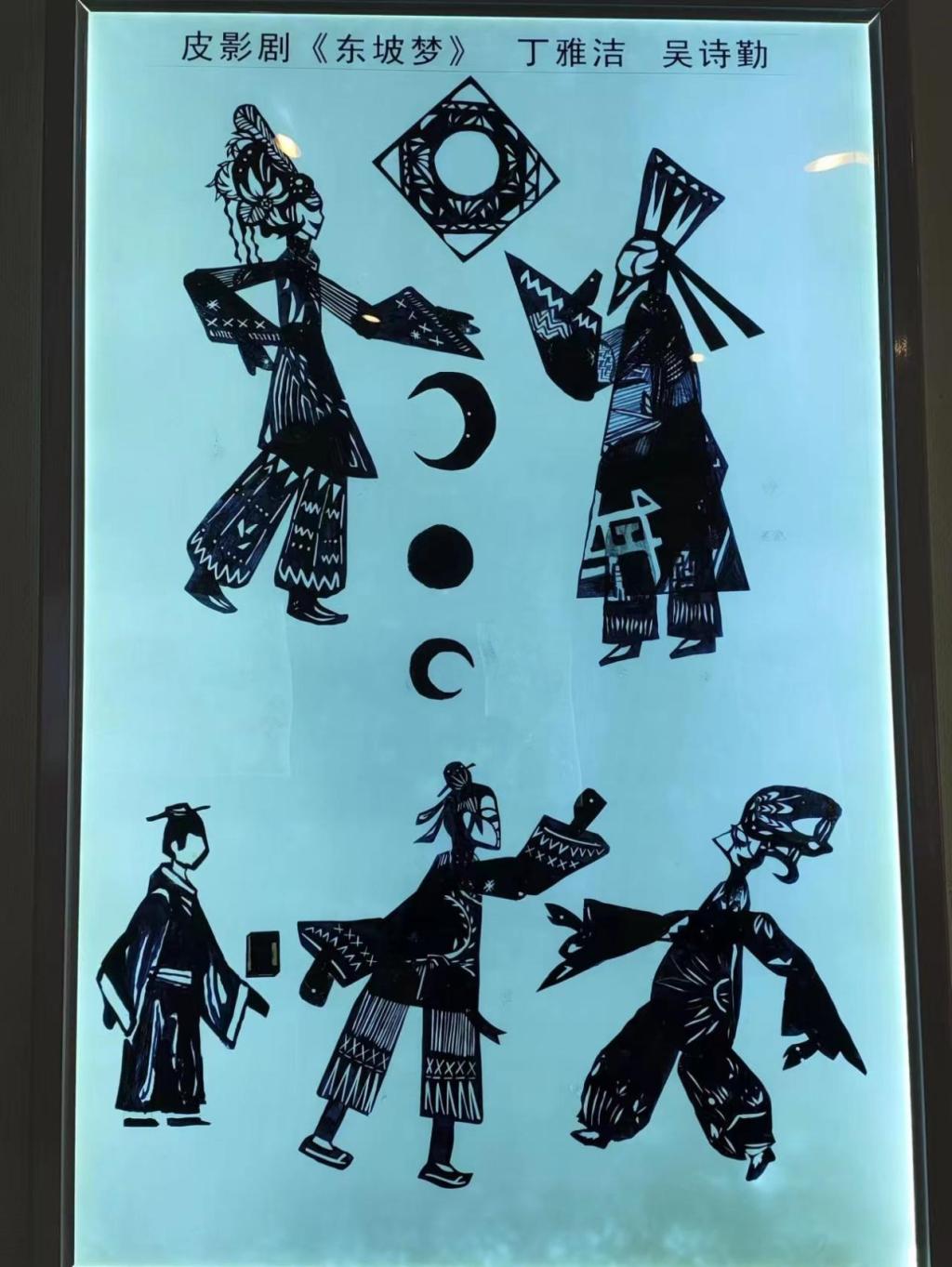 作品《東坡夢》花紋復雜,角色設計上采用了黑白和幾何的效果,其創作者丁雅潔、吳詩勤對于角色的選擇說明道:“我們覺得歷史人物比較適合皮影,所以主角從歷史題材中選擇。最初定的角色是李白,事件類似于夢游天姥吟留別,但是夢境這個方式不太方便表現。此時又想到蒲松齡的聊齋,根據聊齋的題材和對相關歷史人物的篩選,我們最終選擇了蘇軾。”關于制作過程,“我們花費了大概兩到三個星期來完成作品,一個星期用來設計角色,一個星期來進行皮影制作,還有幾天時間用來拍攝和剪輯視頻,制作過程中需要注意人物的裝訂和打火機的使用方式以免對皮影造成損傷。”