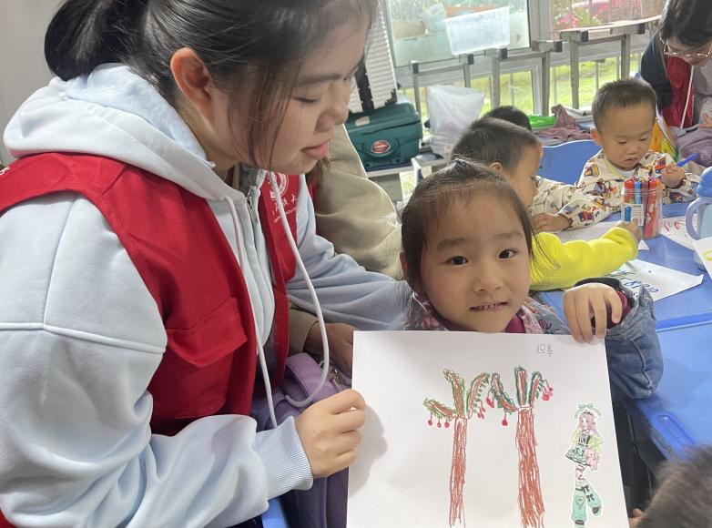 活動接近尾聲時,志愿者向每一個參加活動的小朋友們發放準備好的精美獎品,小朋友們收到獎品十分開心,同時也不忘記感謝志愿者們。有的小朋友熱情地給志愿者一個大大的擁抱,有的小朋友把自己的畫作送給志愿者,志愿者們感受到了小朋友們濃濃的情誼。