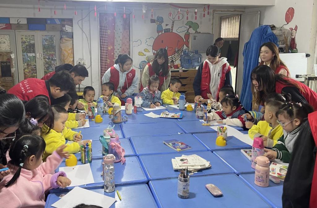 圖為志愿者與小朋友們合作一起繪畫。 公共管理學院 供圖
