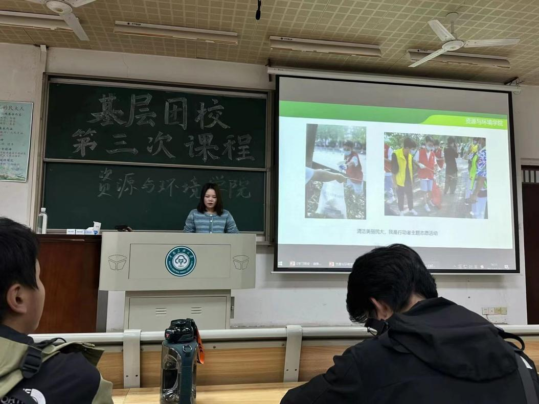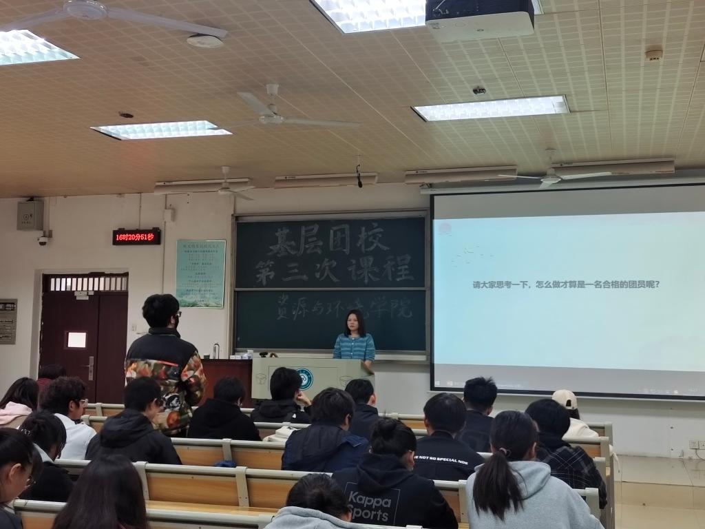 11月22日下午,資源與環境學院2023-2024年度基層團校理論課第三講在11號教學樓200教室如期開展。本次課程由院團委副書記王瑩瑩主講,全體組織部成員及百余名團校學員參與。