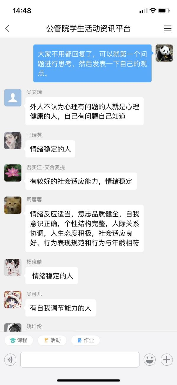 為提高心理委員和寢室長履行職責(zé)的理論水平和專業(yè)能力,為同學(xué)們提供及時有效的心理支持,公共管理學(xué)院于11月24日在學(xué)習(xí)通開展了心理健康知識培訓(xùn)活動,由師軍強老師主持,全院心理委員、寢室長共計200余名同學(xué)積極參與。