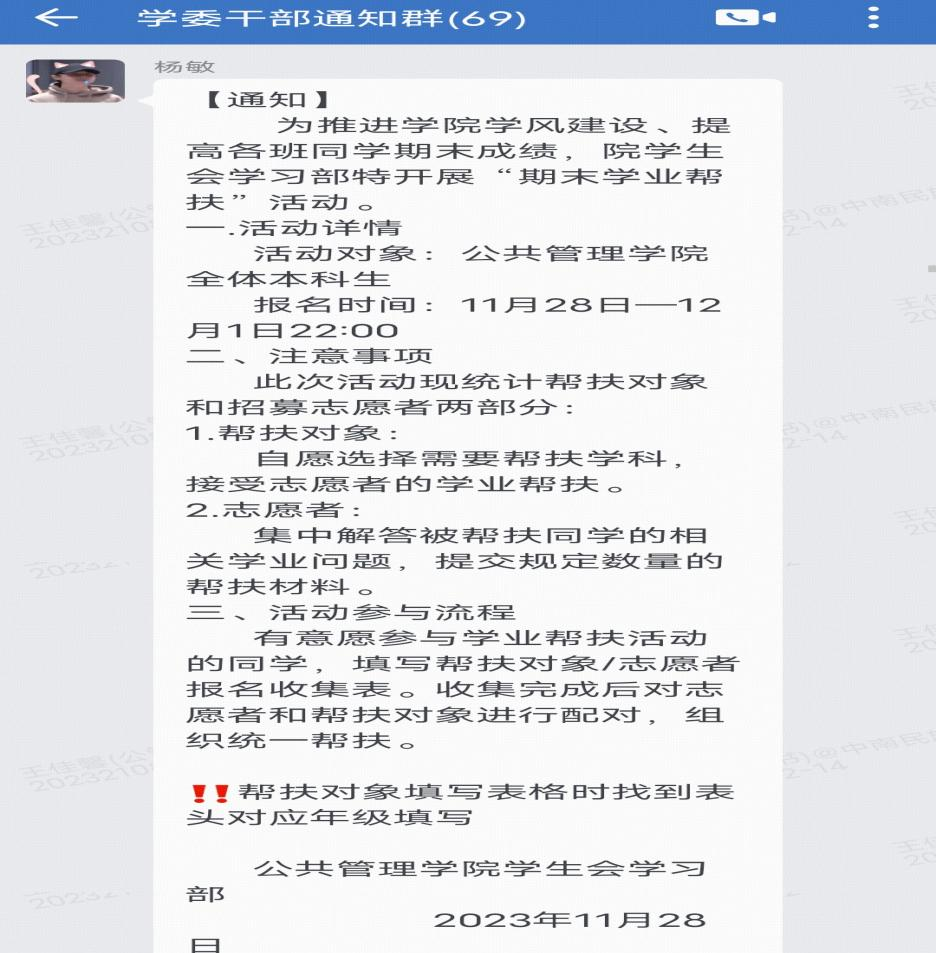 為幫助同學(xué)們更好地應(yīng)對期末考試,進一步促進公共管理學(xué)院學(xué)風建設(shè),踐行“不讓一個學(xué)生掉隊”的教育教學(xué)理念,公共管理學(xué)院學(xué)習(xí)部于11月-12月多次開展學(xué)業(yè)幫扶活動,為有需要的同學(xué)們提供有針對性的指導(dǎo)和支持。