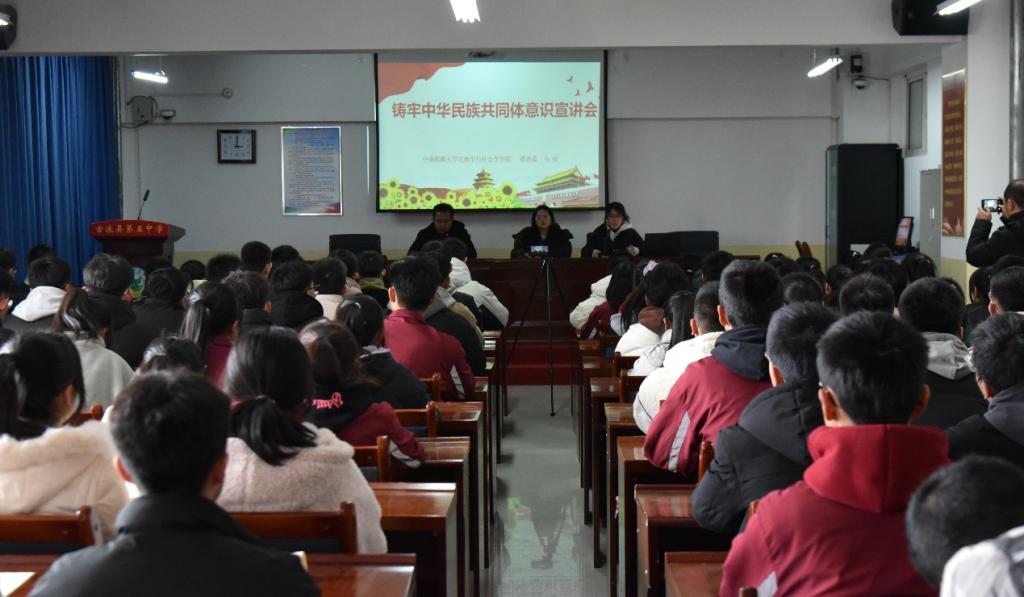 在古浪縣第五中學,團隊成員擺思蕊、馬欣為該校學生作“新征程上鑄牢中華民族共同體意識的青年行動與思考”主題宣講,開啟團隊首次集體跨省宣講。宣講從青年視角出發,聚焦鑄牢中華民族共同體意識的深刻內涵,分析如何實現各民族更好交往交流交融。同時發揮民族高校優勢,著眼我校辦學特色和育人風采,在宣講中融入鑄牢中華民族共同體意識的民大實踐、民大經驗,也為新征程上探索民族高校與民族地方共促鑄牢中華民族共同體意識的合作模式貢獻青年力量。