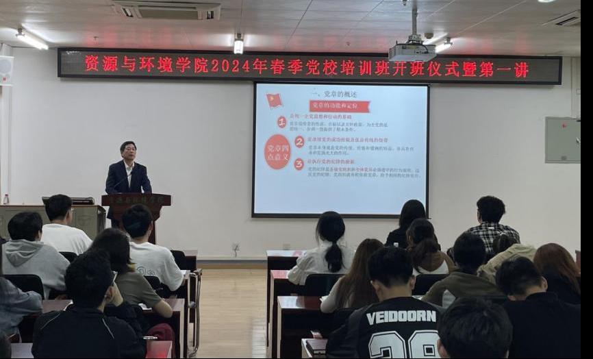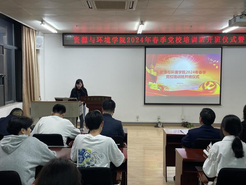 為深入學習貫徹習近平新時代中國特色社會主義思想和黨的二十大精神,鑄牢中華民族共同體意識,切實做好學生黨員發展工作,提高發展黨員質量,4月19日晚,資源與環境學院分黨校在13號教學樓261會議室舉辦2024年春季培訓班開班儀式暨第一堂黨課,學院組織員唐光海、黨委副書記藍永麗、學工辦主任黃晴及入黨積極分子培訓班、發展對象培訓班、預備黨員培訓班全體學員參加活動。活動由藍永麗主持。