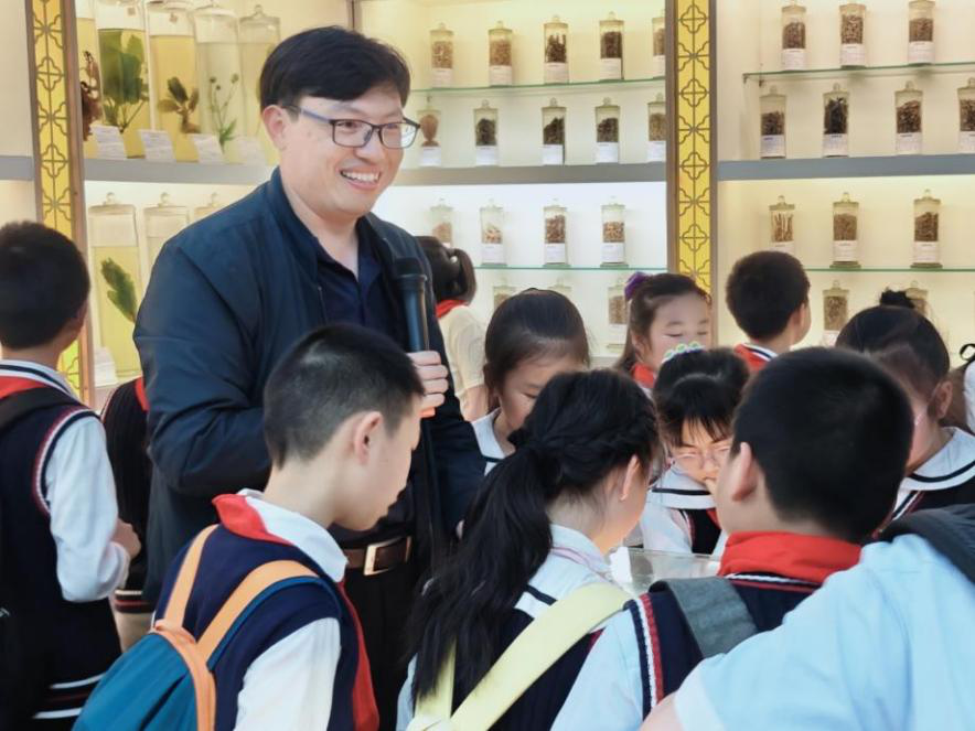 在李小軍副院長的講解和帶領(lǐng)下,同學(xué)們興致勃勃地參觀了浸制標(biāo)本區(qū)、臘葉標(biāo)本區(qū)等多個(gè)展區(qū)。李小軍副院長結(jié)合館內(nèi)所陳列的中藥標(biāo)本及圖片,圍繞中藥材的生存環(huán)境、體態(tài)特征、生態(tài)價(jià)值等多個(gè)方面,給同學(xué)們生動(dòng)形象地介紹了曼陀羅、人參、冬蟲夏草等中藥材。同學(xué)們們一邊聽一邊問,切身感受中醫(yī)藥帶來的獨(dú)特魅力。