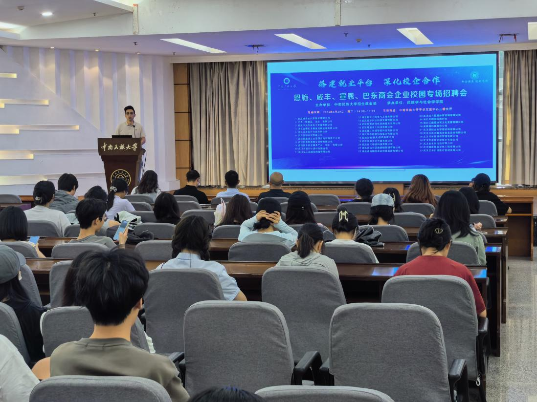 5月29日下午,由我校招生就業工作處主辦、民族學與社會學學院承辦的恩施、咸豐、宜恩、巴東商會企業校園專場招聘會系列活動在我校學術交流中心二樓舉行,面向民社學院和我校應屆畢業生開展公司宣講會和招聘活動。