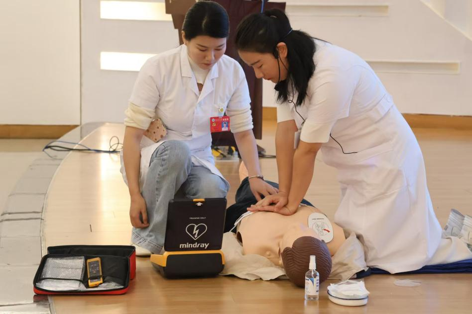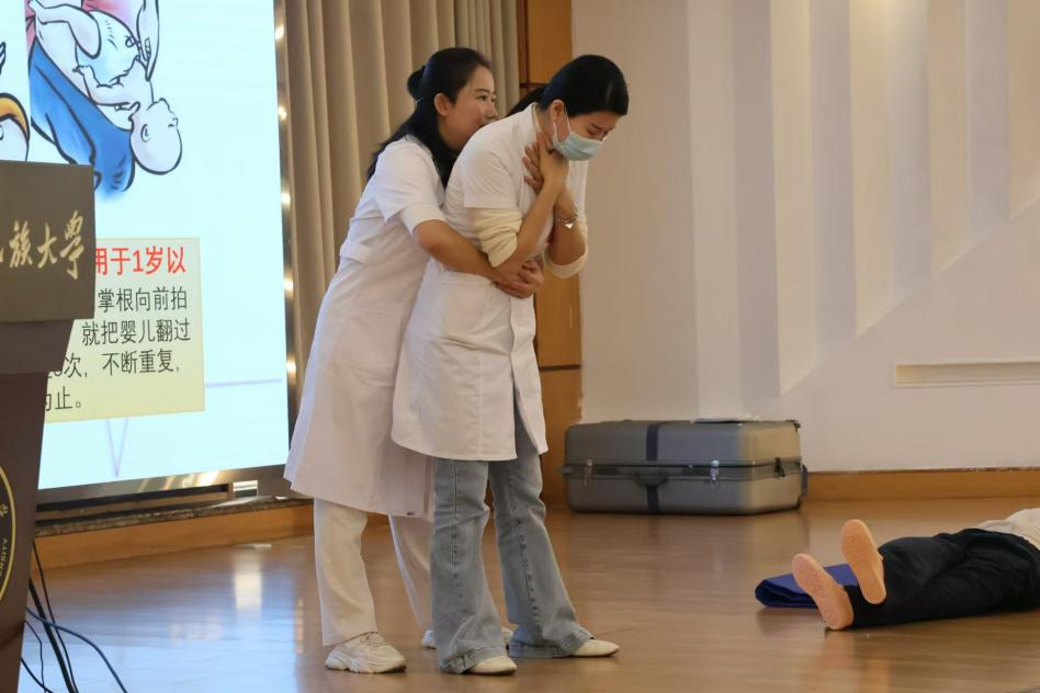 楊冰老師以通俗易懂的方式講解了海姆立克急救法和心臟復蘇術的應用,并用兩個簡單的口訣“剪刀石頭布、拍五按五”來普及海姆立克急救法。此外,她還與同事一起現場演示了標準的海姆立克急救法和心臟復蘇術。