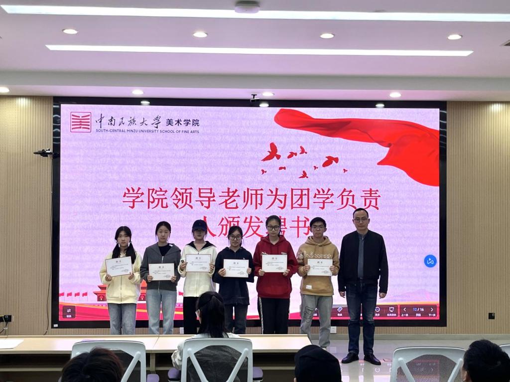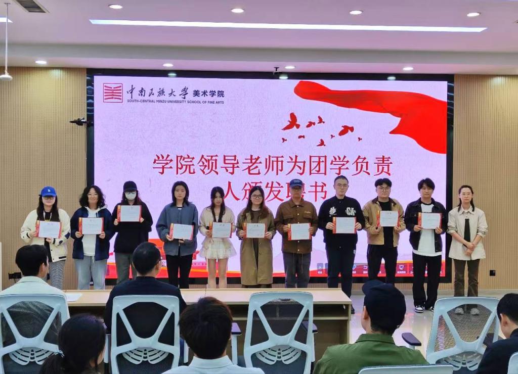 美術(shù)學院團委副書記張丁(右一)為團學主要負責人頒發(fā)聘書。 郝曉蕊 攝