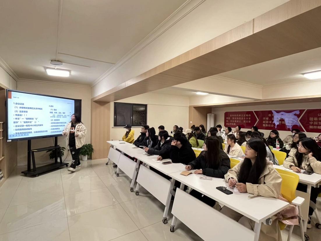 針對此次培訓會,韋春怡學姐分為辦公軟件的使用以及學生工作兩大方面傳授經驗。首先是辦公軟件使用的培訓。編輯會議記錄以及通知是作為團學干部必備的工作技能,韋春怡學姐根據紅頭文件的格式要求詳細向同學們作出指導和教學,并使用典型案例帶領同學們分析、修改,幫助同學們更快掌握此項技能。簽到表及考勤記錄表也是幫助團學干部進行工作的重要工具。對此,韋春怡學姐現場演示如何處理電子表格的細節,幫助同學們解答制作電子表格遇到的難題。
