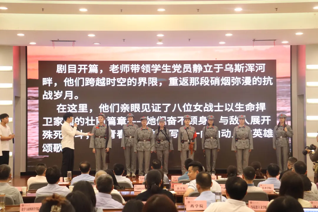法學院西部卓越法治人才實驗班黨支部以情景劇轉接合唱的方式講述抗日戰爭時期東北抗日聯軍8名女戰士與日偽軍展開激戰,生動形象地表現了女戰士崇高的愛國情懷和無畏的犧牲精神,激勵著大家在新時代傳承和弘揚這種偉大的精神。