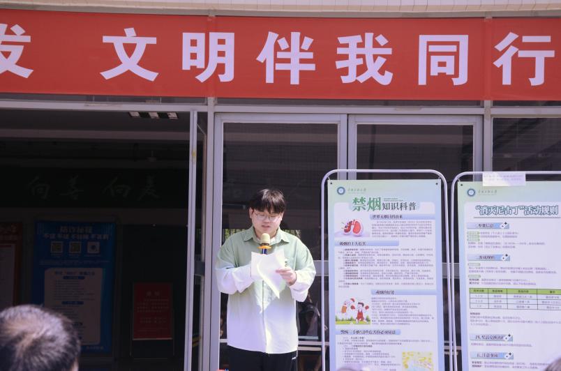 朱嘯天首先向出席儀式的領導和老師致以熱烈歡迎與誠摯謝意,他向大家細致介紹了世界無煙日背景意義、煙草行業發展現狀及活動宗旨,以詳實數據系統剖析煙草對青少年身心健康的多重危害。他強調,當前煙草行業正將目標轉向青少年群體,導致不少學生陷入煙草沉迷,加強煙草危害教育已刻不容緩,呼吁同學們以此為警醒,自覺遠離煙草誘惑,選擇文明健康的生活方式。