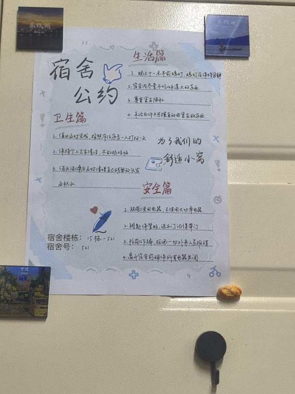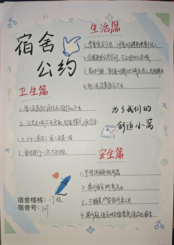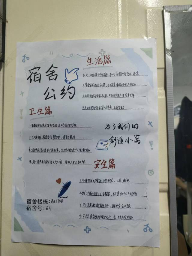 據悉,這批寢室公約已陸續張貼于各宿舍顯要位置,成為同學們自我管理、自我約束的“隱形老師”。薛光洋表示,公約制定不是簡單的規則羅列,而是同學們適應新宿舍生活、學會尊重包容的重要一課,學院將通過定期檢查與日常督導,推動公約從“紙面”落到“行動”,助力構建安全、文明、和諧的宿舍育人環境。