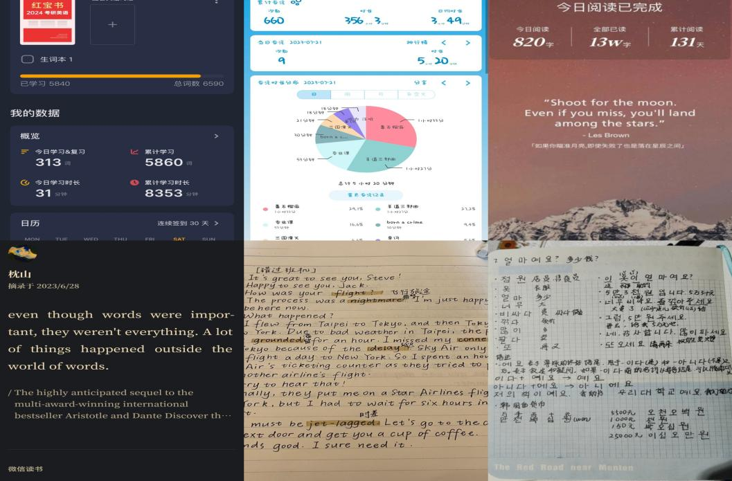 “外語計劃”包括但不限于英語,打卡內容圍繞“聽說讀寫”開展。活動期間,小伙伴們通過各式各樣的學習方法進行打卡,內容包括背單詞、學語法、練口語等,展開了對英語、日語等各類外語的學習。據統計,共有258人參與了外語計劃,共打卡5389次,人均日學習時長達30分鐘,人均日新學單詞50個。小伙伴們每天按時打卡,不缺席,不懈怠,不放棄,以積極進取的姿態自主學習,不僅提高了自己的外語水平,從學習一門語言到學精一門語言,還豐富了暑假生活,在日積月累的打卡學習中不斷成長。