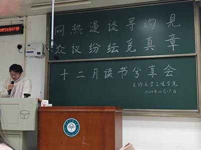 (文/佘江,圖/董雅迪)為了培養(yǎng)同學們的批判性思維,激發(fā)理工科學生的人文素養(yǎng)與綜合思考能力,引導同學們正確看待網絡、社會熱點事件,樹立正確的價值觀,生物醫(yī)學工程學院于12月19日下午,在15棟205教室舉辦了主題為“網熱漫談尋灼見,眾議紛紜覓真章”的讀書分享會。讀書小組指導老師張朱珊瑩、院團委書記葉穎、院團委副書記魏邱霞以及院團委學生會主席團成員出席本次活動。本次活動由2024級阮詩涵主持。