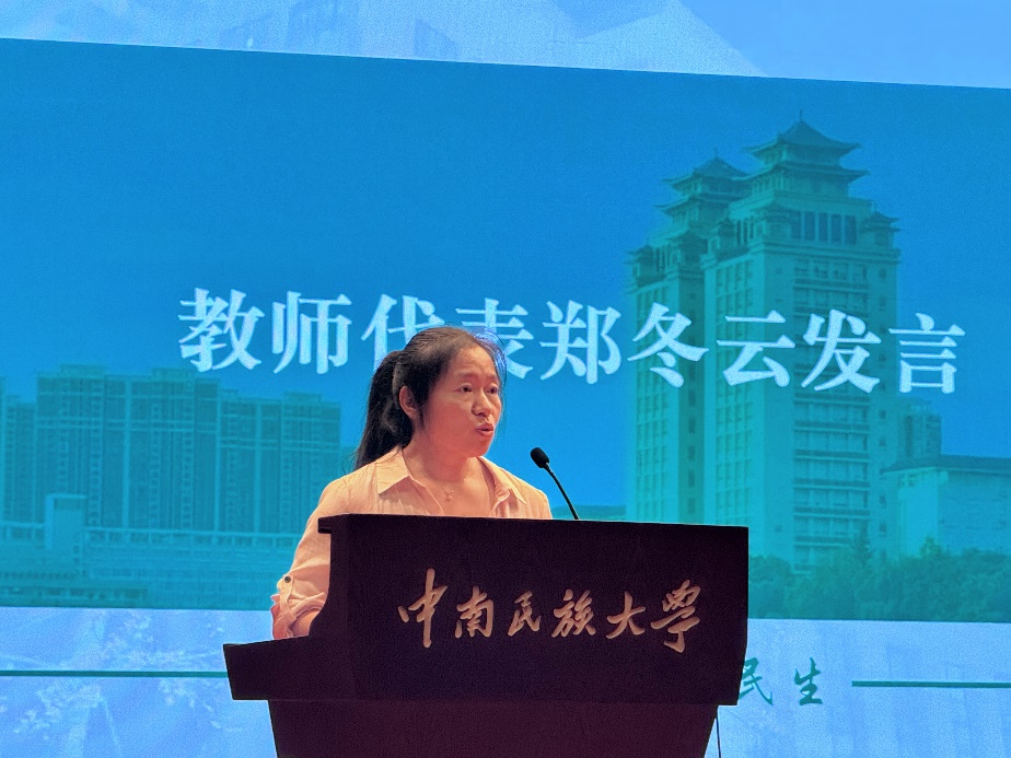 教師代表、生醫2503班導師鄭冬云以輕松幽默又飽含深意的發言贏得陣陣掌聲。她連用三個“歡迎”向新生傳遞出武漢、民大和生醫學院的溫暖與包容。作為班導師,她笑稱自己將是同學們“永遠在線的新手村指導員和非官方客服”,并送上三句“通關秘籍”:緊盯主線任務——學業,不忽略支線——社團與友誼;善待同窗,珍惜并肩作戰的伙伴;善用校園資源,勇敢探索、遵守規則。