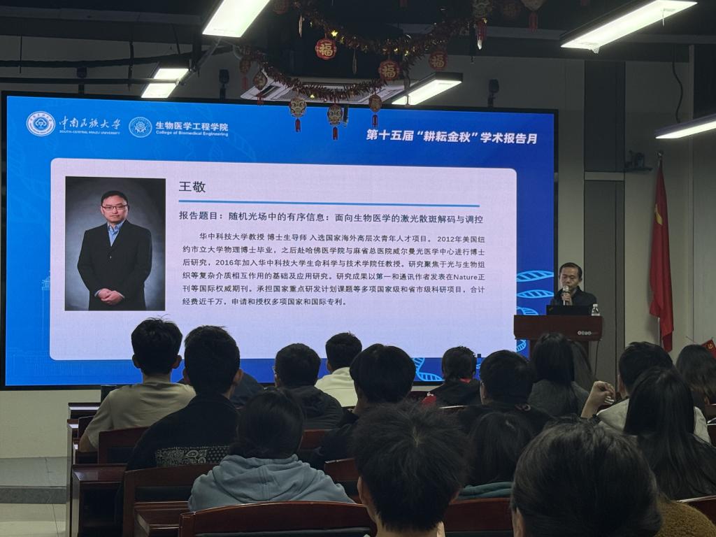 (文/何慶 圖/陳卉丹)2025年11月14日下午,我院在16號(hào)教學(xué)樓713會(huì)議室舉辦“耕耘金秋”學(xué)術(shù)報(bào)告會(huì),特邀華中科技大學(xué)王敬教授作題為《隨機(jī)光場中的有序信息:面向生物醫(yī)學(xué)的激光散斑解碼與調(diào)控》的學(xué)術(shù)報(bào)告。此次講座由院長陽小飛教授主持,部分導(dǎo)師和2024級(jí)、2025級(jí)研究生參加。