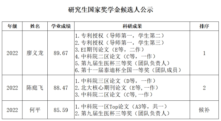 根據(jù)《中南民族大學研究生國家獎學金評審實施辦法(修訂)》(民大發(fā)〔2018〕21號)和《生物醫(yī)學工程學院研究生國家獎學金評審實施細則》及相關(guān)文件精神,經(jīng)研究生個人申報,學院研究生國家獎學金評審小組綜合評議,并報學院黨委會審議通過,確定2024年生物醫(yī)學工程學院研究生國家獎學金候選人名單,現(xiàn)公示如下: