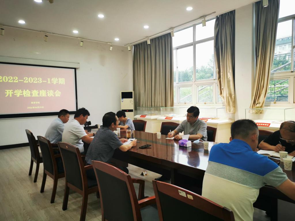 聽課結束后,在體育學院榮譽室召開了新學期開學檢查座談會。楊騫書記代表學院對李金林校長的蒞臨指導表示熱烈歡迎。郝家春院長從師生基本構成、返校數據統計、暑期主要工作、開學準備情況、重點工作安排以及存在主要問題等方面進行了較為全面的匯報。體育學院副書記鄭重、副院長韓斌、范石漢分別就分管工作做了簡要匯報。