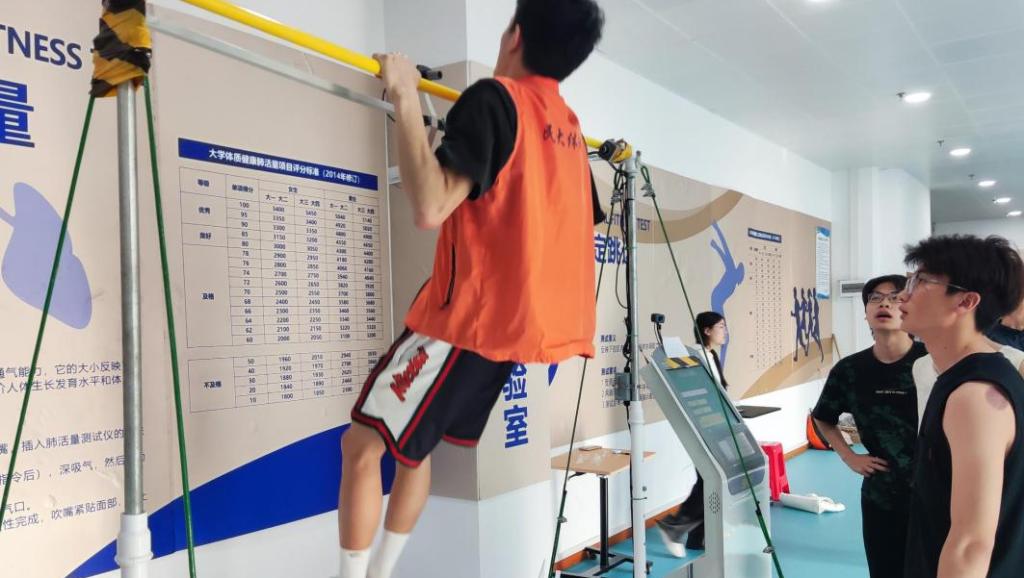 在17號(hào)教學(xué)樓智能體側(cè)實(shí)驗(yàn)室,志愿者為參與仰臥起坐、引體向上、立定跳遠(yuǎn)、有氧肺活量等項(xiàng)目測試的學(xué)生提供指導(dǎo),糾正動(dòng)作,講解測試要點(diǎn)。