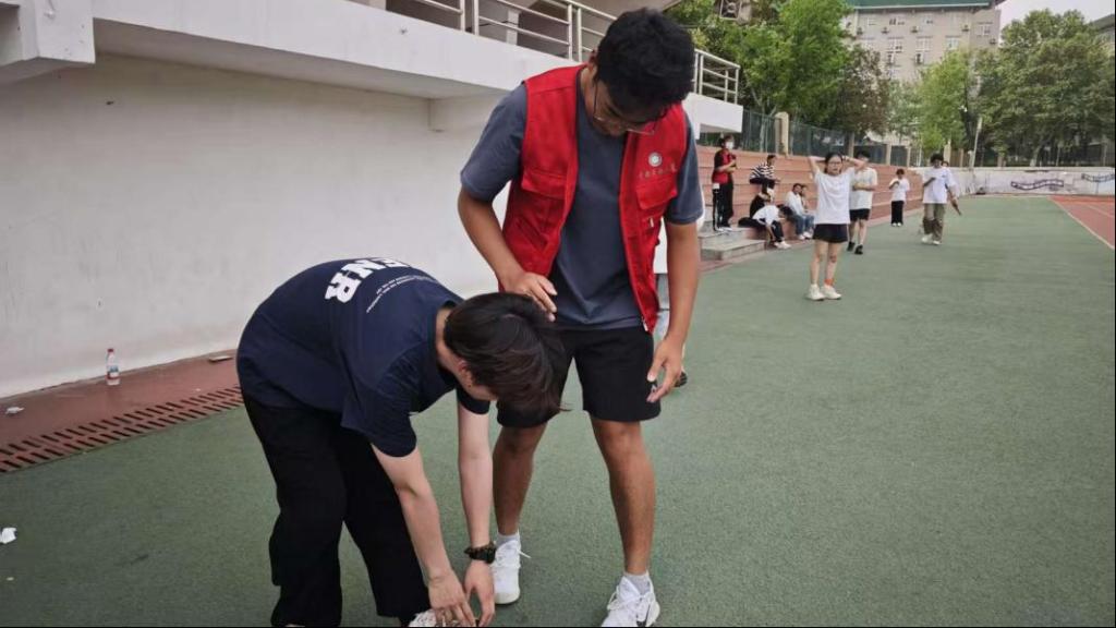 在南湖操場,針對(duì)50米跑、800米跑(女生)、1000米跑(男生)項(xiàng)目,志愿者帶領(lǐng)學(xué)生進(jìn)行熱身,跑步時(shí)為學(xué)生加油鼓勵(lì),結(jié)束后指導(dǎo)學(xué)生進(jìn)行拉伸。