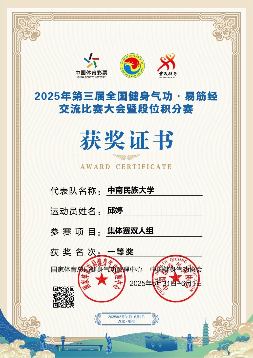 5月31日,第三屆全國健身氣功·易筋經(jīng)交流比賽大會暨段位積分賽在湖北鄂州正式開賽。中南民族大學(xué)體育學(xué)院邱婷老師代表學(xué)校參賽,和張穎慧老師在健身氣功·易筋經(jīng)集體賽雙人組項(xiàng)目中脫穎而出,以最高分?jǐn)孬@一等獎,為學(xué)校贏得了榮譽(yù)。