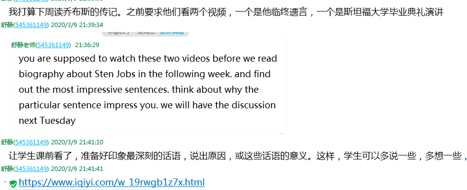 大英三室于2月17日開始第一周遠程授課,到現在已經開展了11周教學工作。11周的教學實踐中,大英三系五位老師經常在教學工作群討論線上授課過程的問題,比如線上授課如何避免教師主宰的滿堂灌問題,老師們設計好課程授課方案,首先提前布置課堂發言任務,學生在課堂有準備的發言中體驗英語使用,同時也有機會展現對所閱讀文章的深入思考。