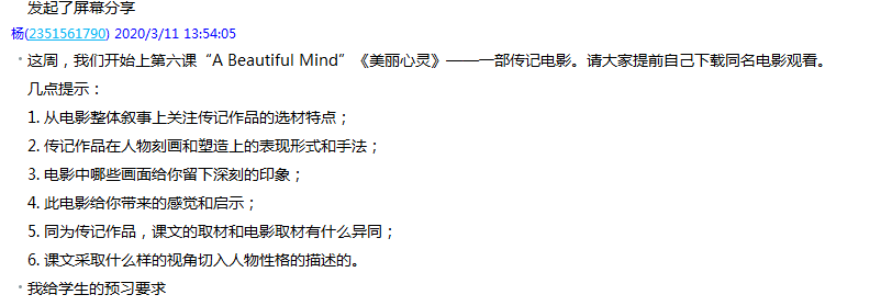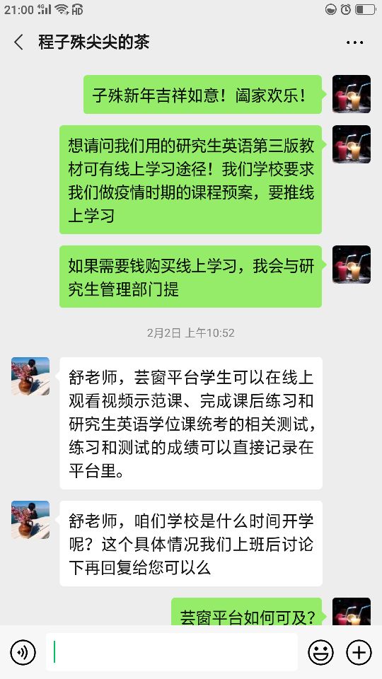 大英三系老師在認真研究蕓窗平臺教學資源后,多次在教學工作群討論,一致決定以蕓窗平臺為教材支撐,進行實時授課,力求達到線下面授課程授課質量,依舊以培養研究生批判性思維能力為主要目標。為了確保網上授課順利進行,老師們寒假期間多次在教學工作群討論上課途徑,積極學習使用QQ群屏幕共享功能,并進行實時測試,保障正式授課不受現代技術障礙影響。周湘萍老師疫期在廣州父母家過年,因擔心手機操作不方便,特意購買新電腦,確保授課順利進行。楊琍玲老師身處武漢,將家里閑置已久的臺式電腦調試好,保障授課需要。