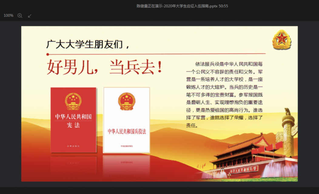 同時,陳老師也簡單介紹到大學生參軍的優惠政策,包括優先優待、選拔培養、復學升學以及退役就業等多方面優勢。疫情之下,就業形勢不容樂觀,應征入伍不失為提升個人素質、提高就業競爭力的一種優質選擇。