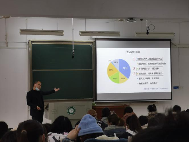 本次講座從考研背景、動機(jī)、收益、規(guī)劃及時間安排等方面向大家全方位介紹考研總體情況。首先,熊鵬老師介紹了近年來的考研形勢以及人數(shù)變化,引導(dǎo)大家思考為什么選擇考研,明確考研動機(jī),并指出,考研是現(xiàn)階段同學(xué)們最保值的選擇,隨社會對學(xué)歷要求越來越高,大學(xué)學(xué)歷逐漸“貶值”,讀研將成為人生巔峰堅實(shí)的一腳。緊接著,熊鵬老師帶領(lǐng)大家認(rèn)清考研大趨勢,了解當(dāng)前嚴(yán)峻形勢,并向同學(xué)們詳細(xì)介紹專碩和學(xué)碩的區(qū)別,老師提醒大家,隨著研究生內(nèi)部競爭愈發(fā)激烈,考研、求職前置化趨勢嚴(yán)重,大家應(yīng)提前做準(zhǔn)備。