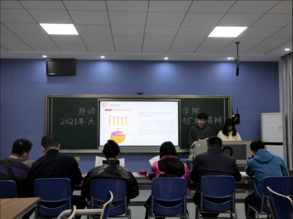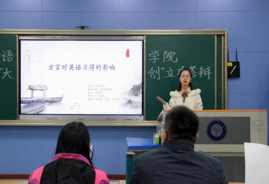 答辯分為項目展示和評委提問兩個環(huán)節(jié)。四組代表圍繞語言學(xué)習(xí)、教育、旅游經(jīng)濟與地域特色等,結(jié)合PPT逐一闡述研究目的、研究困難及解決方案。