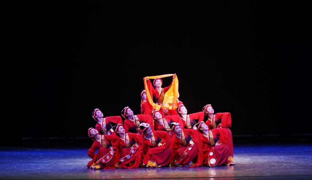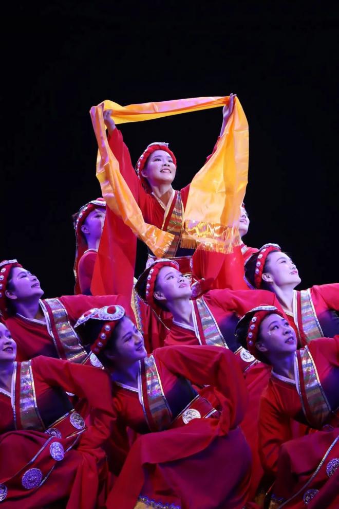 獻哈達 圖片源于校學生會 外語學院本次參賽節目以“唱支山歌給黨聽”為主題,向中國共產黨成立100周年獻禮。舞者們身著紅裙,飛揚水袖,踏著輕快的鼓點翩然起舞,隨著音樂的變化,舞蹈動作時而奔放激昂,時而溫柔似水。舞蹈最后,《唱支山歌給黨聽》的激昂旋律響起,舞者們相和高唱,展現了藏族姑娘的純潔與真誠,訴說著藏族人民對黨的愛戴與祝?!,F場氣氛熱烈,外院舞者們整齊劃一的動作和優美的身姿贏得了陣陣掌聲。