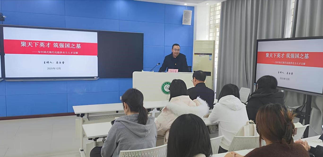 為深入學習宣傳貫徹黨的二十屆四中全會精神,推動全會精神在基層入腦入心、落地生根,12月8日下午,校黨委常委、副校長馬玉堂教授到外語學院,聚焦推動高水平科技自立自強,為中國式現代化提供有力人才支撐主題,為師生作專題宣講。外語學院、繼續教育學院領導班子成員,英語系黨支部全體黨員,外國語類2501班全體學生參加。會議由外語學院黨委書記李春雷主持。