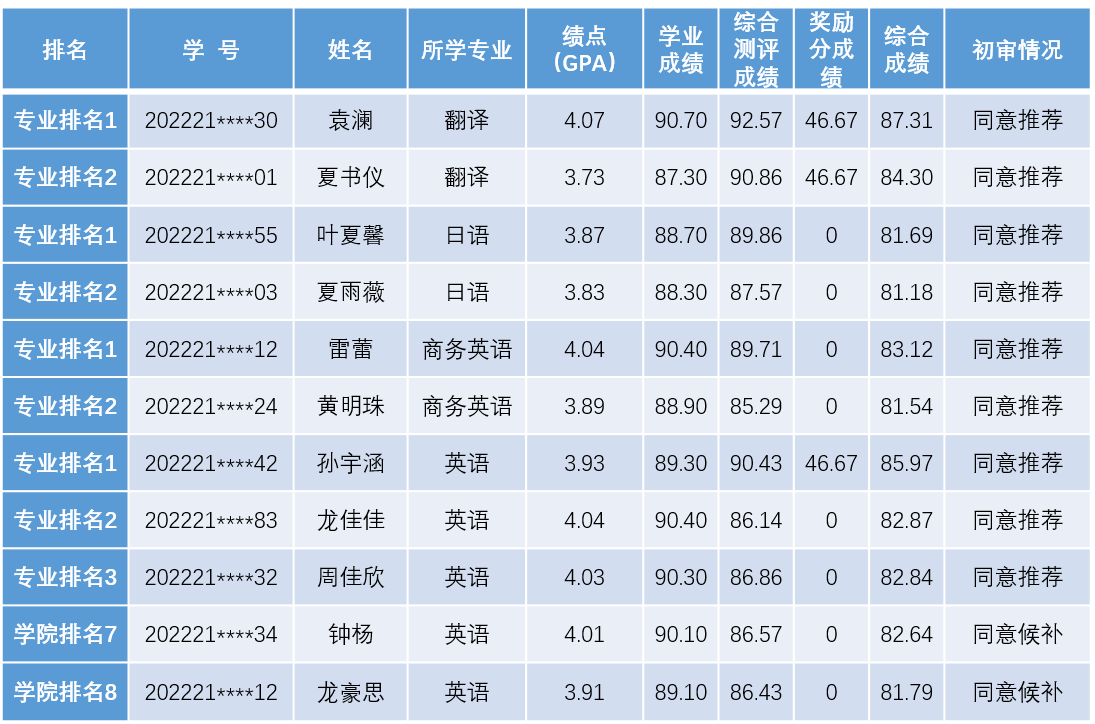 根據(jù)《中南民族大學推薦優(yōu)秀應屆本科畢業(yè)生免試攻讀碩士學位研究生工作管理辦法(修訂)》(民大教學〔2024〕49號)和《關于做好推薦2026屆優(yōu)秀本科畢業(yè)生免試攻讀碩士學位研究生工作的通知》等文件精神,經(jīng)過報名資格審查、學業(yè)成績核算、獎勵加分認定、綜合測評考核等環(huán)節(jié)工作,經(jīng)學院推免工作小組審定,學院黨政聯(lián)席會研究,現(xiàn)將外語學院擬推薦2026屆優(yōu)秀本科畢業(yè)生免試攻讀碩士學位研究生名單公示如下: