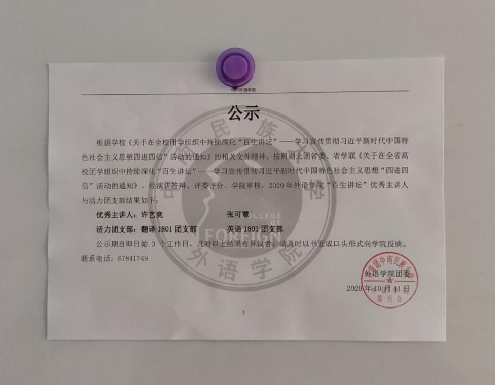 經評選,翻譯1801班團組織、英語1801班團組織獲“活力團組織”稱號,許藝競、張可慧獲“優秀主講人”稱號。