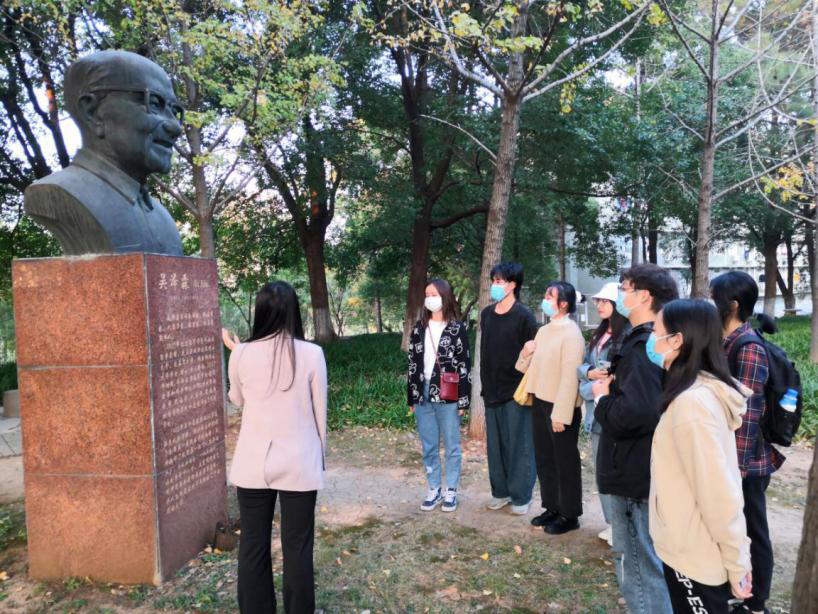第九組的組員們進入圖書館,參觀校史館,來到吳澤霖教授的雕像前,瞻仰偉人,學習偉人。他們秉持“篤行好學,自然寬和”的校訓,他們在實踐中得到真知,領略到黨的關懷,學校的力量。