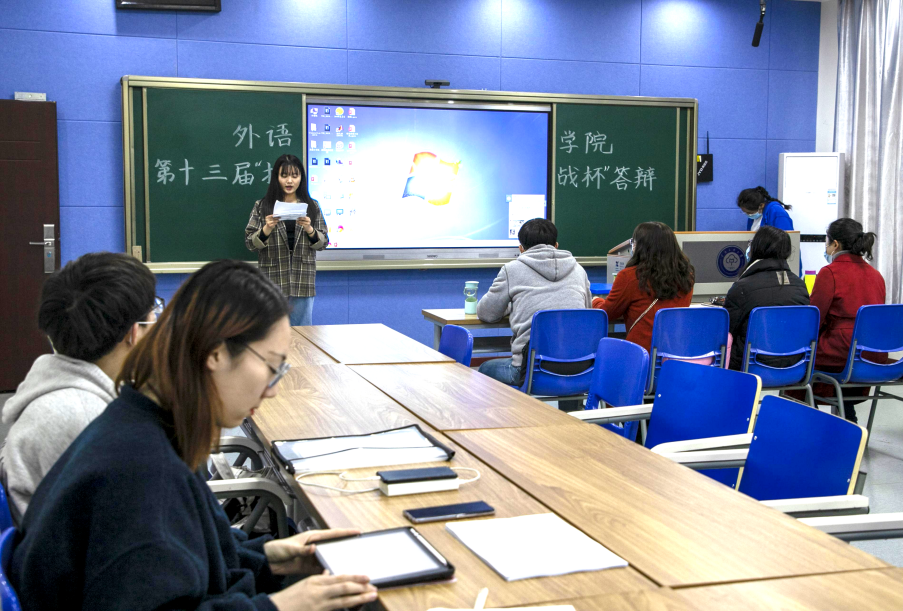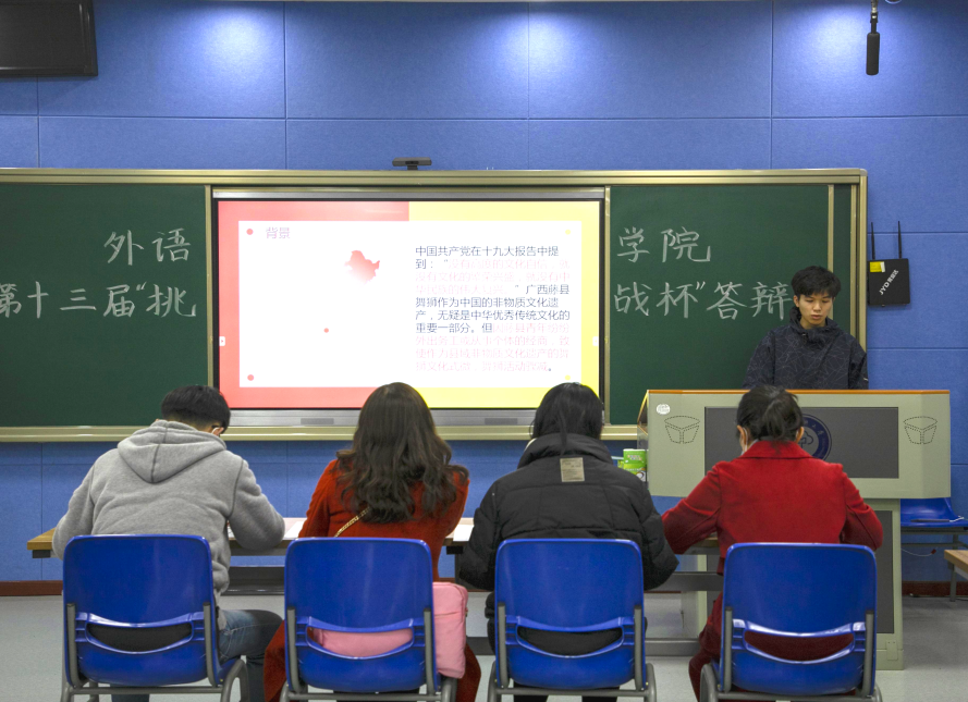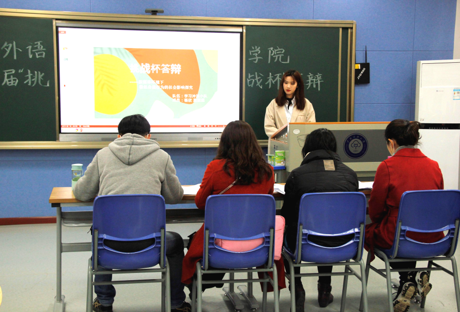 本次答辯賽分為答辯與提問兩個環節。六個參賽小組圍繞粉絲效應、傳統文化發展、跨國文化等內容依次答辯,結合PPT和紙質報告書展示研究成果,闡述自身對社會現象的思考,提出解決方案。其中,第五組的同學歷時兩年完成《文旅融合視域下民族地區非遺新經濟發展模式探究》,成果頗豐,得到評委們的一致肯定。