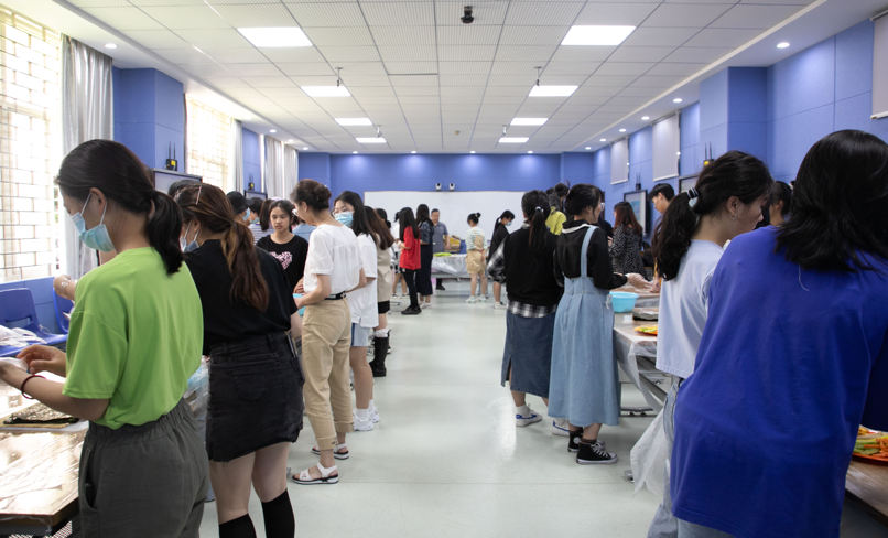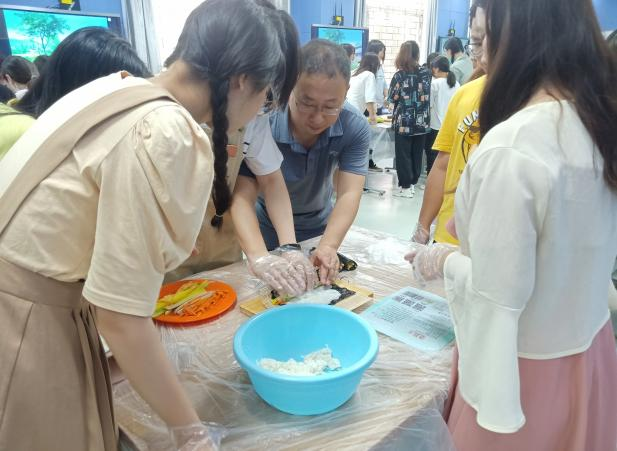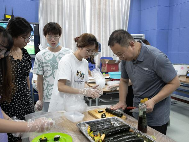 活動開始前,食材和所需工具均已齊備,同學們分為十組,入場后按組別就位,佩戴手套。趙海波老師為同學們進行示范,強調(diào)制作要點。制作過程中,各組同學相互配合,動手能力不斷提高,友誼不斷加深。在此期間,趙海波老師對各組同學進行了耐心指導和“手把手”教學?;顒蝇F(xiàn)場氣氛活躍熱烈,同學們積極動手,歡聲笑語,收獲滿滿。