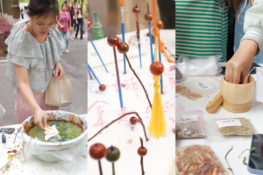 在眾多活動中,香囊制作和植物拓染環(huán)節(jié)尤其受到同學(xué)們的青睞。他們精心挑選香料、填囊,采集葉片浸染、拓印,每一個步驟都充滿了對傳統(tǒng)工藝的好奇與探索。在完成自己的手工藝品后,同學(xué)們紛紛向身邊的朋友展示成果,并邀請他們一同參與到這一富有意義的活動中來。